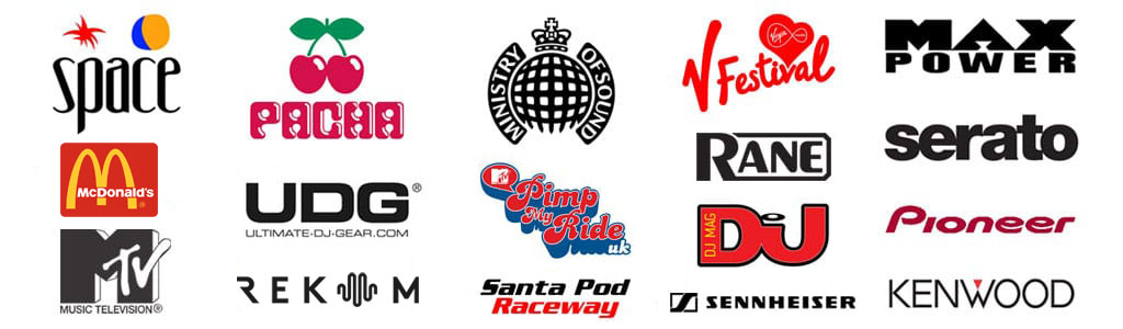 Space Nightclub, Pacha Nightclub, Ministry of Sound, Santa Pod Raceway, V Festival, SEMA, Max Power Magazine, Mcdonalds, MTV, Deltic, Itunes, Kenwood, Pioneer, Rane (brand ambassador), Rekom, Denon, DMC, Kicker, Citronic, UDG, Stanton, DC Shoes, Vibe Audio, Serato, Sennheiser, Smoove, Nuts, Redline, Fast Car, Zoo, and DJ magazine.